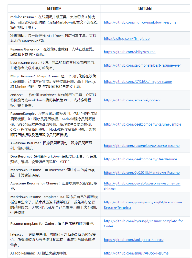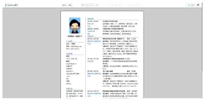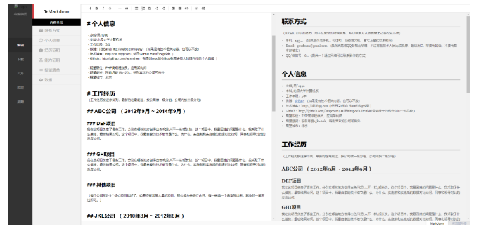 上面该注意的点和需要掌握的技能都已经提及了,接下来我们需要制作一份简洁明了的简历模板,个人比较推荐使用Markdown的简历模板,这样我们不需要考虑字体和字号问题,简历内容编写完成后导出PDF格式即可,这里我推荐几个免费的在线Markdown简历制作工具: