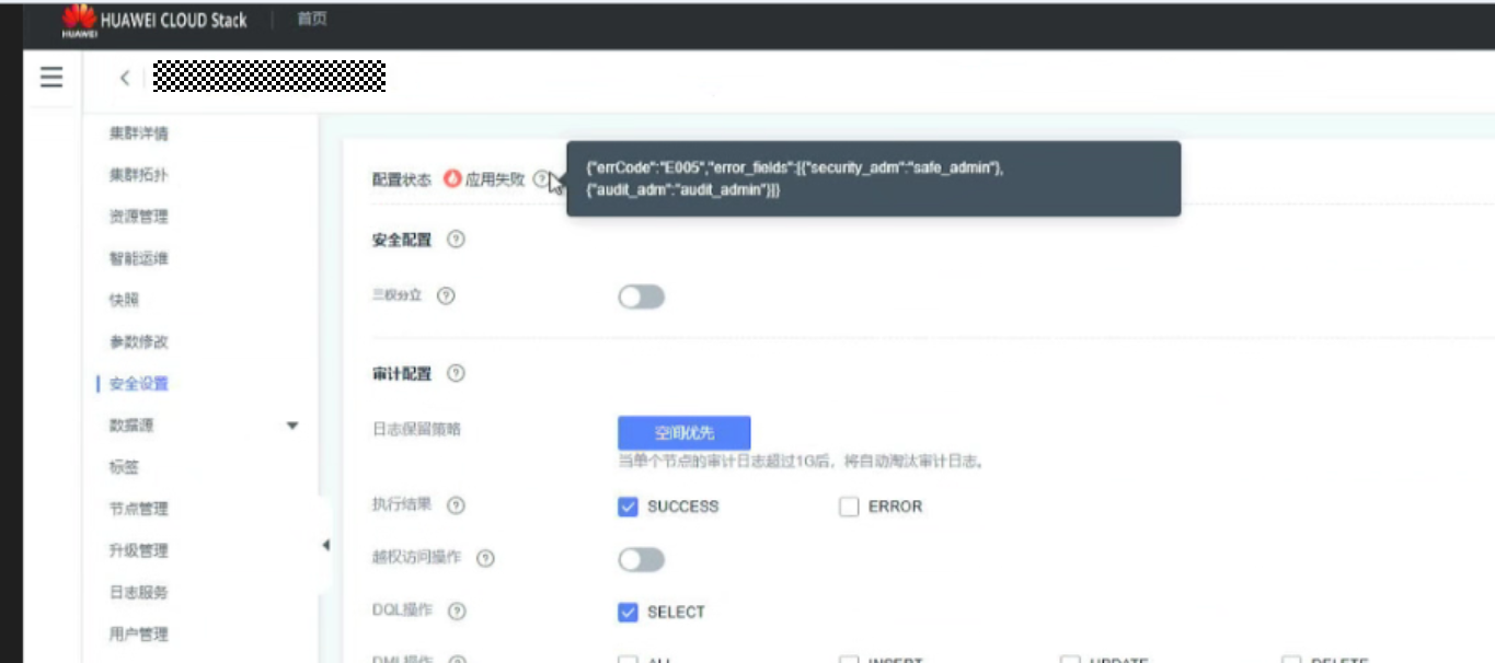 1、开始打开并配置三权分立账号后,想恢复初始状态,直接在用户管理里面删除三权分立配置的账号,导致后期关闭后打开三权分立开关失败如下图