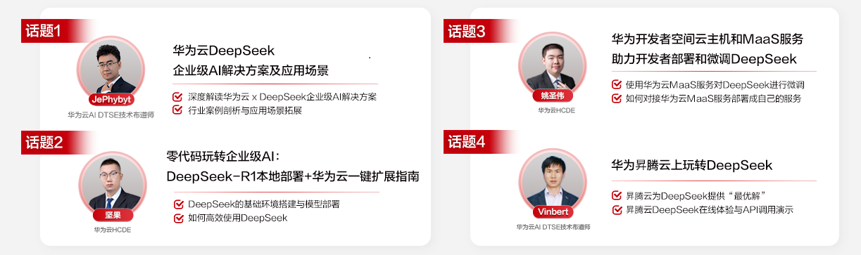 在DTT No.77期《华为云 x DeepSeek:AI驱动云上应用创新》 直播中,4位来自华为云DTSE、HCDE的开发者伙伴,一起聚焦 AI 与云计算的深度融合,围绕DeepSeek在云上的应用案例,在线探讨如何利用 AI 驱动云上应用创新,并为线上的的开发者伙伴们分享了丰富的DeepSeek与华为云结合的优秀案例与实践。
