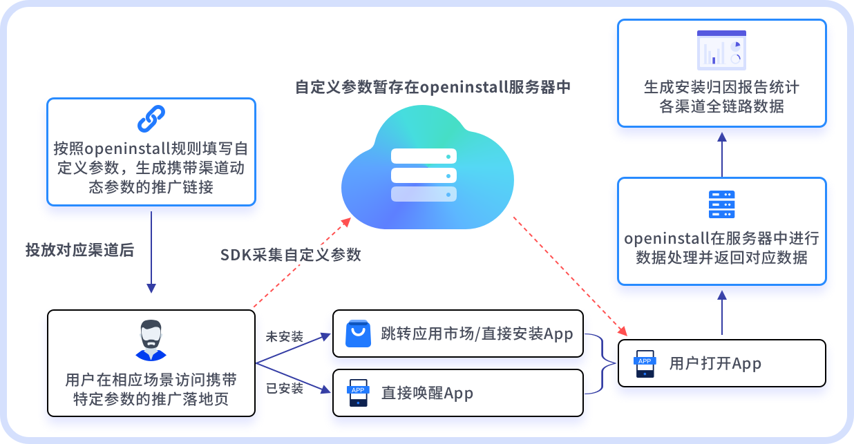 openinstall的传参安装功能,通过在下载链接中嵌入自定义参数,并将参数传递至安装后的App中,实现来源精准标记与数据自动归因。其实现流程分为三步: