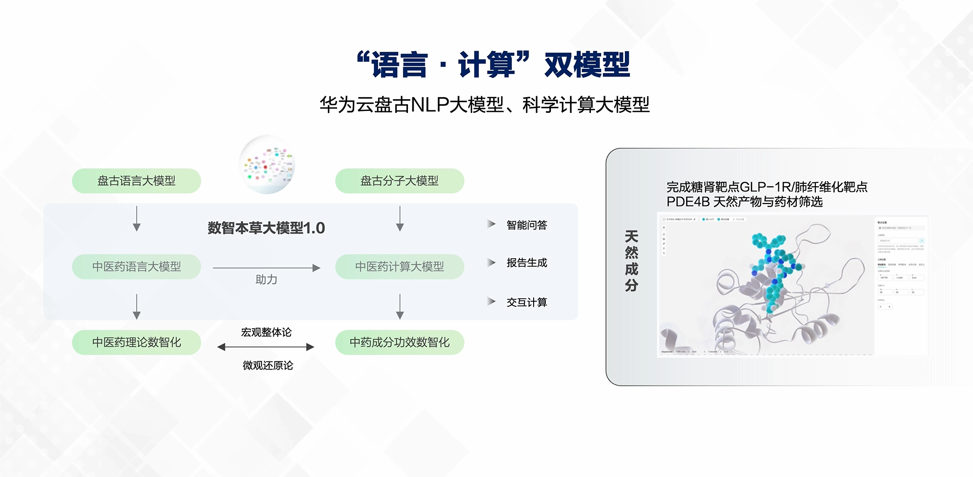 大模型应用开发负责人杨鹏程称,“数智本草大模型是基于华为云盘古大模型的语言和计算双模型打造的智慧大模型。”其中,语言大模型具有380亿参数,基于中医药大量文本数据进行预训练,并结合向量库检索和多场景微调。在计算大模型中,预训练了数十亿分子结构,通过350万特有天然产物分子数据微调,能够精确执行分子表征和属性预测等任务,配合算法快速筛选和优化药材与复方。