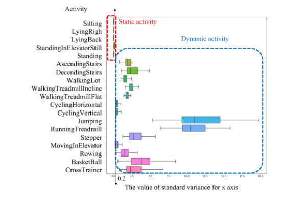 作者研究了几个常见的HAR数据集(比如UCI-HAR、WISDM、PAMAP),发现了一个简单却超级实用的规律:静态活动(坐着、站着)和动态活动(走路、跑步)在加速度计数据上的表现差别很大。具体来说,他们看的是加速度计x轴数据的标准差(STDEVX)。静态活动时,人几乎不动,STDEVX很小;动态活动时,身体晃来晃去,STDEVX就大得多。