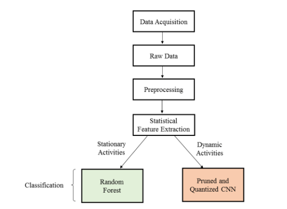 这篇论文的核心之处在于,它把HAR任务拆成了两步走,还用上了三种武器:轻量级特征提取、随机森林(RF)和剪枝量化后的CNN(PQ-CNN)。下面我详细聊聊这三部分的原理。