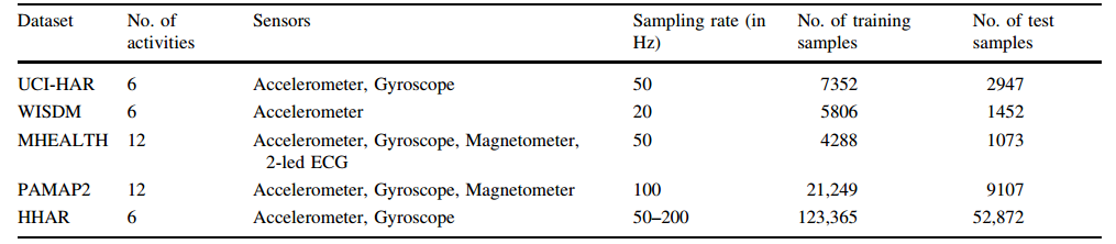 下面出了五个数据集的汇总信息。UCI-HAR、WISDM和HHAR数据集包含6个活动,但传感器数量不同。MHEALTH和PAMAP2这两个数据集都包含12种活动和更多附加传感器。HHAR包含最多的训练和测试数据,而PAMAP2与其他数据集相比包含更多的附加传感器。