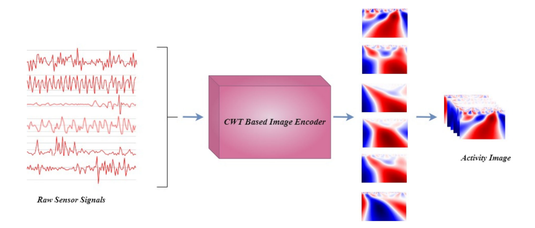 首先,作者采用了连续小波变换(CWT)来将原始的传感器时间序列数据编码成图像。CWT是一种有效的数学工具,用于信号处理,它可以将时域信号转换为时频域的表示形式。通过选择适当的母小波函数,CWT能够生成反映信号局部特性的系数。