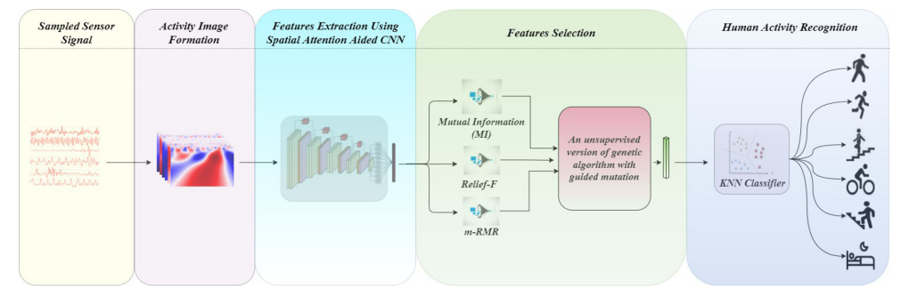为了解决这些问题,本文提出了一种基于可穿戴传感器数据的HAR混合架构。首先使用连续小波变换(Continuous Wavelet Transform, CWT)对传感器数据的时间序列进行编码,将其转换为多通道图像。然后,利用空间注意力辅助的卷积神经网络(CNN)提取更高维度的特征。为了找到识别人类活动最本质的特征,开发了一种新的特征选择(Feature Selection, FS)方法。首先采用三种基于过滤器的方法:互信息(Mutual Information, MI)、Relief-F和最小冗余最大相关性(minimum redundancy maximum relevance, mRMR)来评估特征的适应度。然后,通过修改版的遗传算法(Genetic Algorithm, GA)移除排名较低的特征来选择最佳特征集。最后使用K-最近邻(K-Nearest Neighbors, KNN)分类器对人类活动进行分类。通过在五个知名的公共HAR数据集上的全面实验,证明了该模型在分类性能上显著优于现有的最先进模型。同时,观察到使用基于GA的特征选择技术在降低特征数量的同时,提高了整体识别准确性。