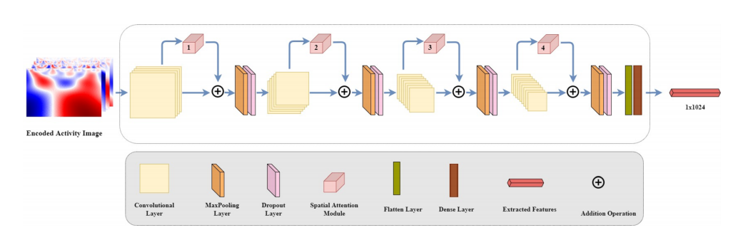 将传感器数据转换为图像表示后,可以利用深度学习模型来提取特征。作者通过CWT将每个传感器样本转换为一个多通道的2D图像,其中每个通道对应于传感器的一个轴。