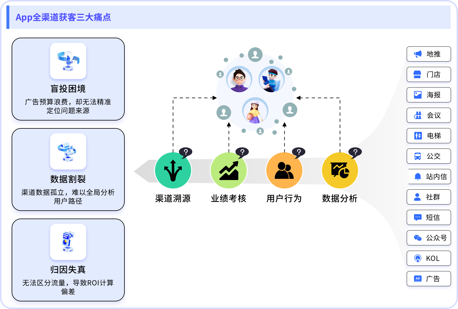 • “盲投”困境:50%以上的广告预算浪费在无效渠道,却无法精准定位问题来源;