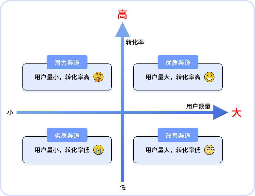 进阶需求:分析渠道用户质量(留存、付费率)、跨渠道协同效应。