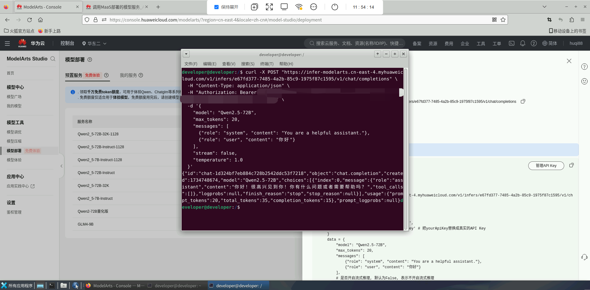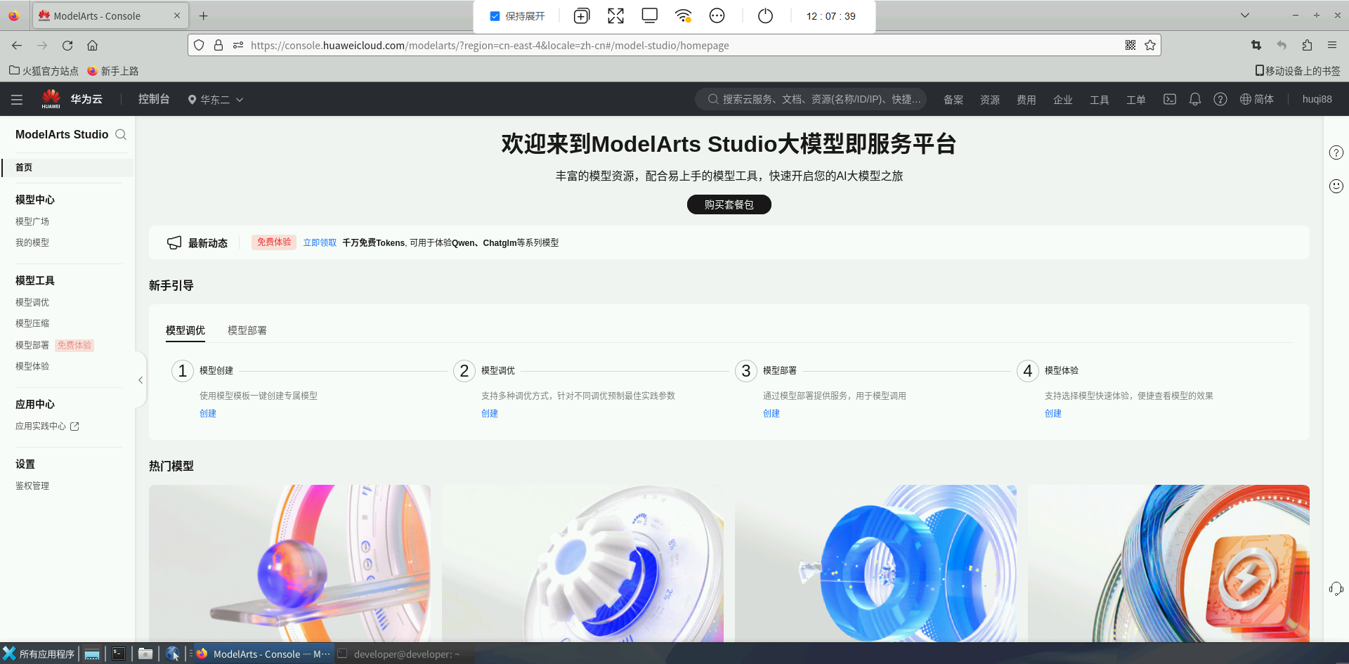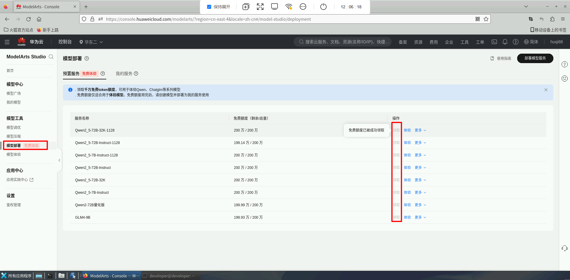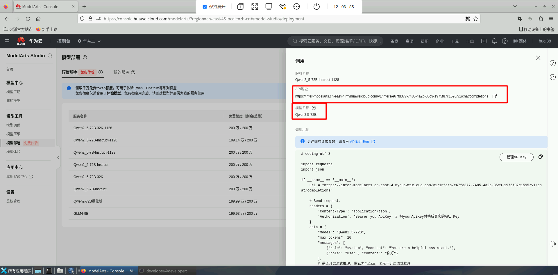 进入云主机,打开浏览器,输入 https://console.huaweicloud.cn/modelarts/?region=cn-east-4&locale=zh-cn#/model-studio/deployment ,即可访问ModelArts Studio。