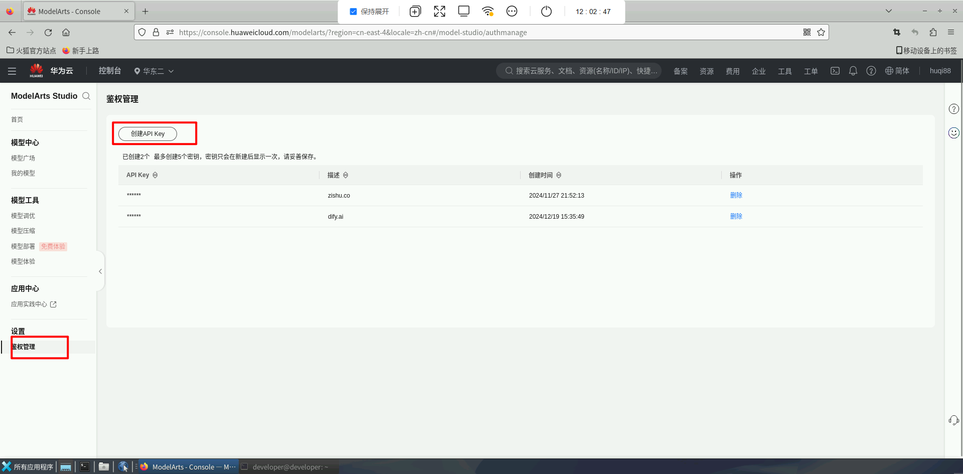 左侧鉴权管理-创建API Key,保存创建的密钥信息