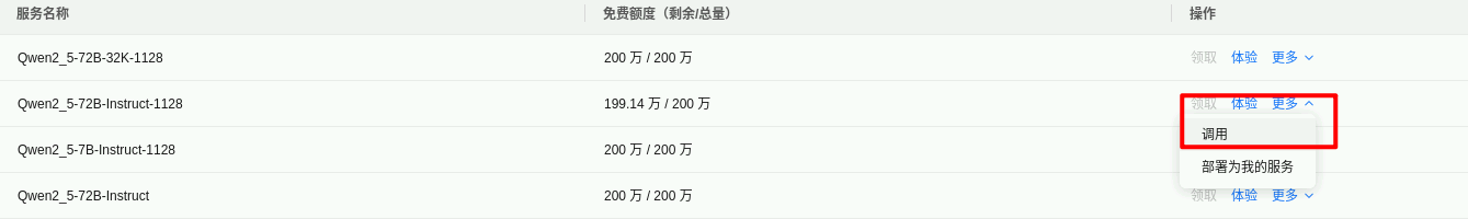 以Qwen2_5-72B-Instruct为例,点击更多-调用,获取API地址和模型名称。