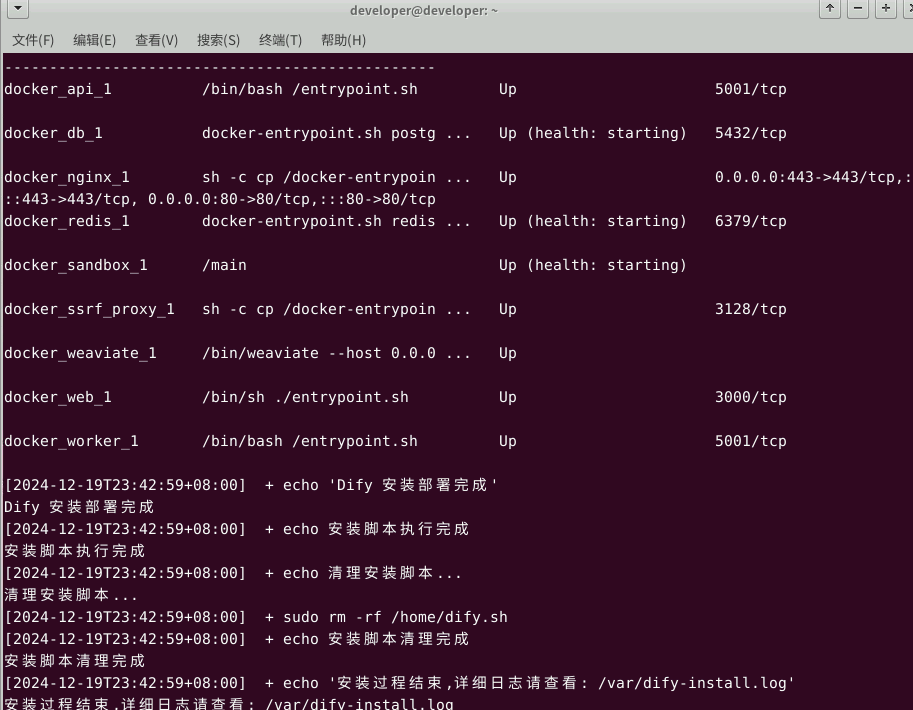 安装完毕后显示安装过程结束,详细日志请查看: /var/dify-install.log 即为安装成功。
