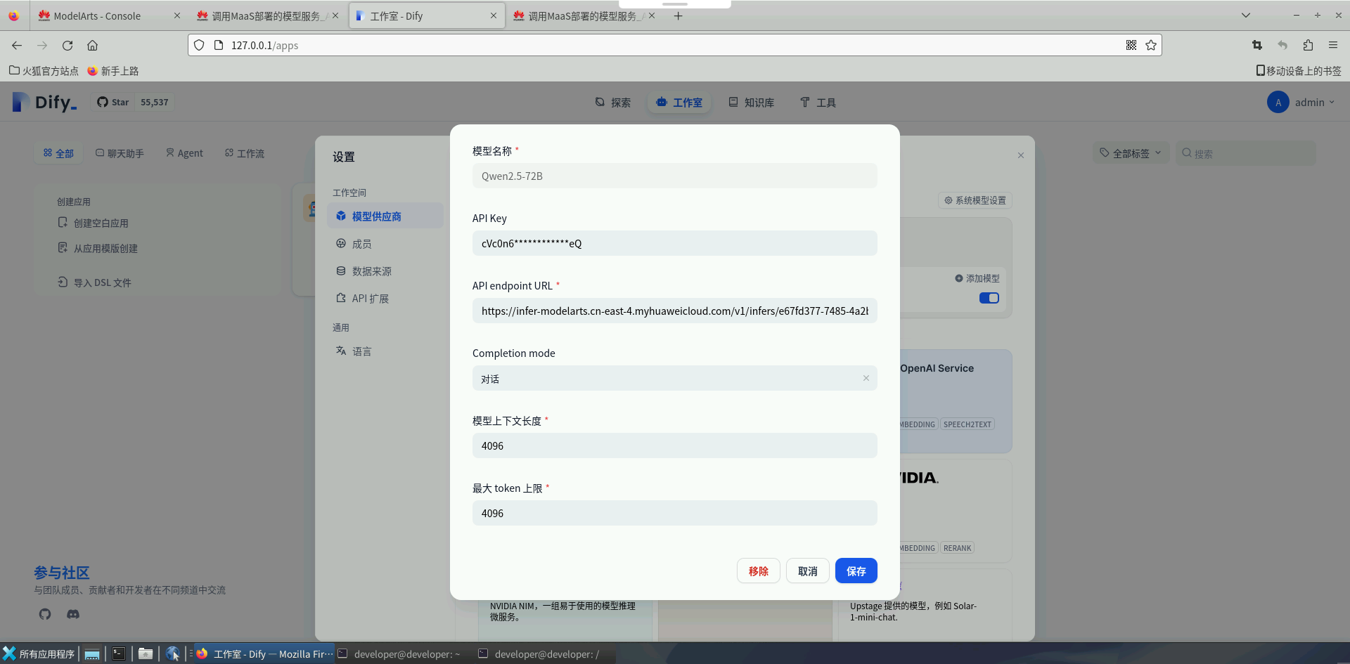 API Key请填入步骤2.1.4中创建的API KeyAPI endpoint URL请填入步骤2.1.3中的API地址,并且删除最后面chat/completions部分Completion mode请选择对话- 模型上下文长度\最大 token 上限保持默认