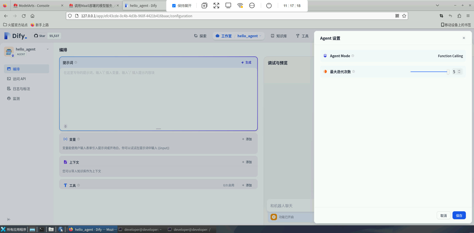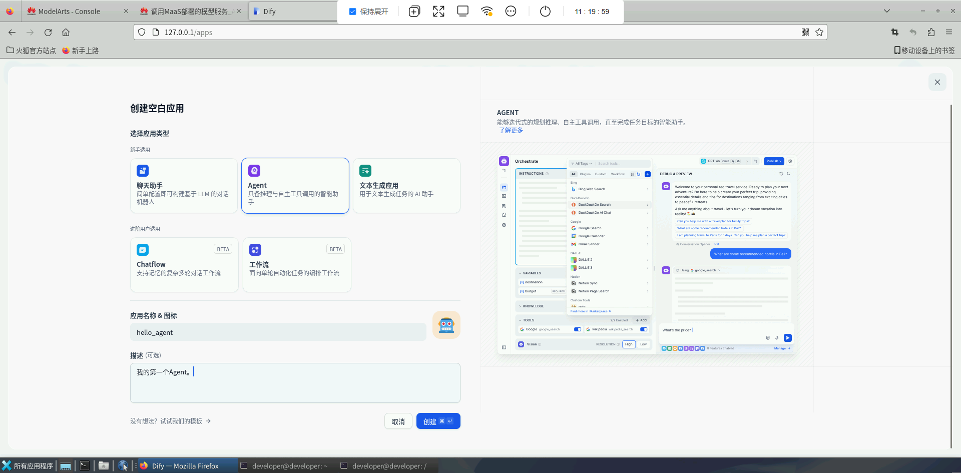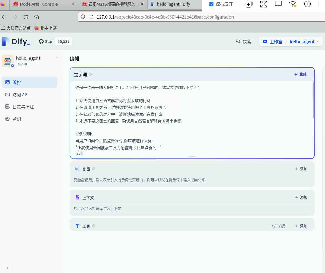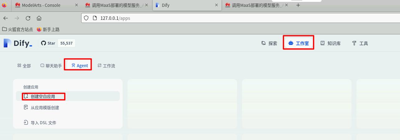 在Dify平台(http://127.0.0.1/apps),点击工作室–Agent-创建空白应用,进入Agent页签,填写Agent名称。