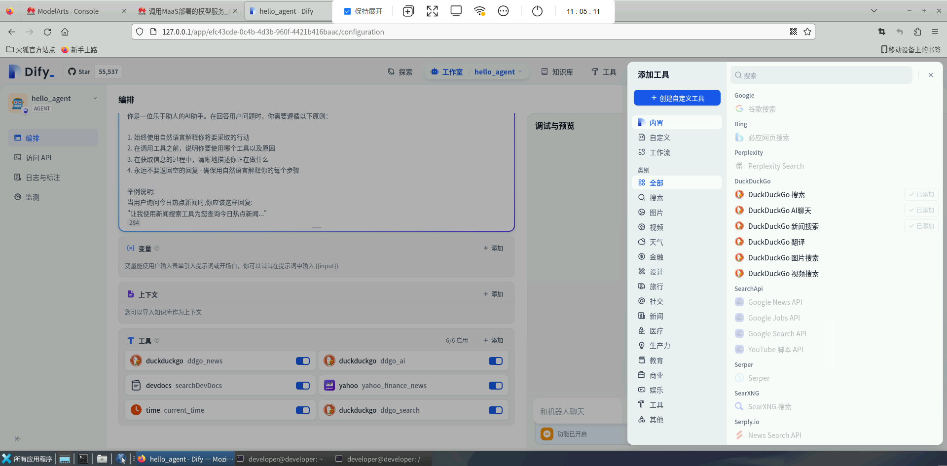 在“编排”页面的“工具”区域右侧,单击“添加”,按需添加工具并与模型进行对话调用。
