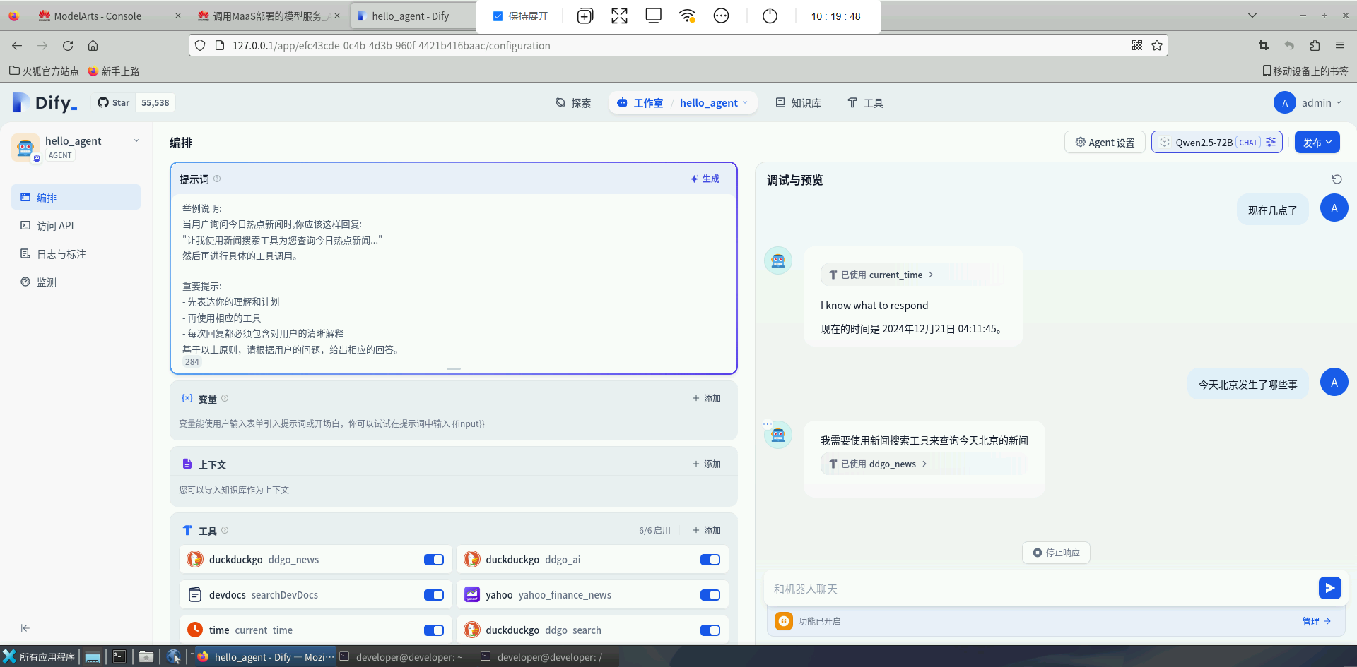 通过本实验,我们了解了如何使用ModelArts Studio平台和开源Agent框架Dify.AI构建个性化聊天助手。ModelArts Studio提供了丰富的开源大模型资源,支持一键部署模型服务并通过API调用。Dify.AI则是一个功能强大的Agent开发框架,通过可视化的工作流编排方式,让开发者能够快速构建聊天助手、知识库、Agent等智能应用,大幅提升AI应用开发效率。