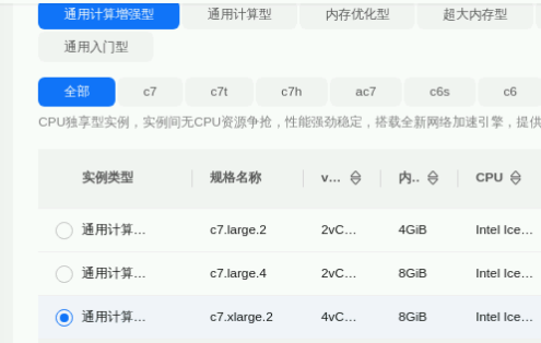 4. 选择“x86计算”架构,规格选择“**c7.xlarge.2**”