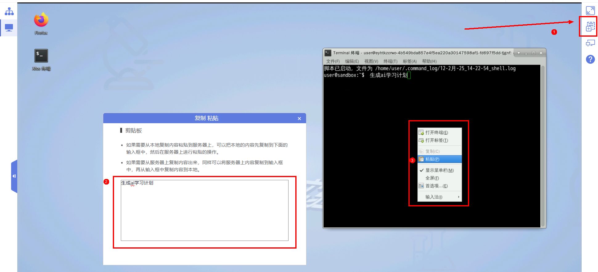 说明:可以通过实验界面右上角的【复制粘贴】向实验桌面传入中文,将要提问的内容粘贴到复制粘贴板上,在待写入的窗口右键,选择粘贴即可。
