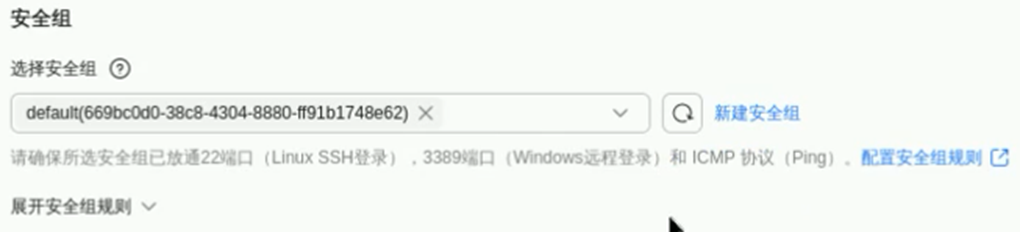 说明:如果没有默认安全组,可点击“新建安全组”创建。