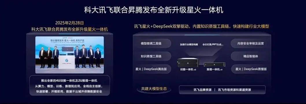 时间回到2025年2月末,科大讯飞联合昇腾发布了全新升级的训推一体机和推理一体机,可兼容讯飞星火和DeepSeek双模型,同时内置了模型微调工具链、知识蒸馏工具链、精品智能体等工具,进一步缩短了大模型的落地流程,加速了大模型能力到产业生产力的转化。