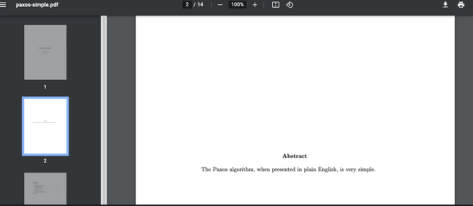 《Paxos Made Simple》这篇论文就 14 页,相比于 《The Part-Time Parliament》的 33 页精简了不少。最关键的是这篇论文的摘要就一句话: