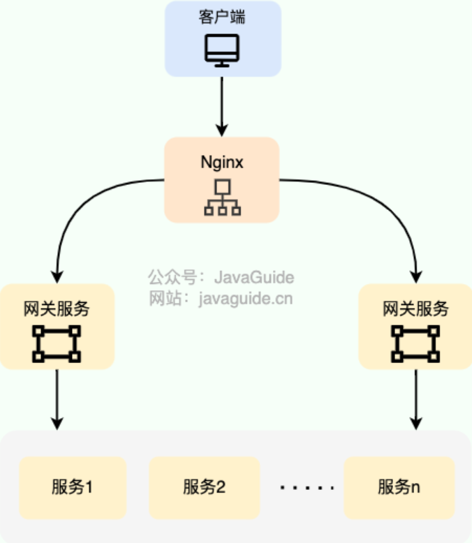 如下图所示,网关服务外层通过 Nginx(其他负载均衡设备/软件也行) 进⾏负载转发以达到⾼可⽤。Nginx 在部署的时候,尽量也要考虑高可用,避免单点风险。