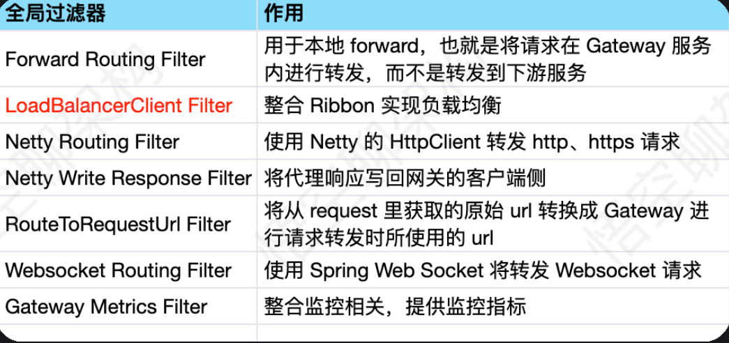 GatewayFilter:局部过滤器,应用在单个路由或一组路由上的过滤器。标红色表示比较常用的过滤器。 GlobalFilter:全局过滤器,应用在所有路由上的过滤器。 局部过滤器 常见的局部过滤器如下图所示: