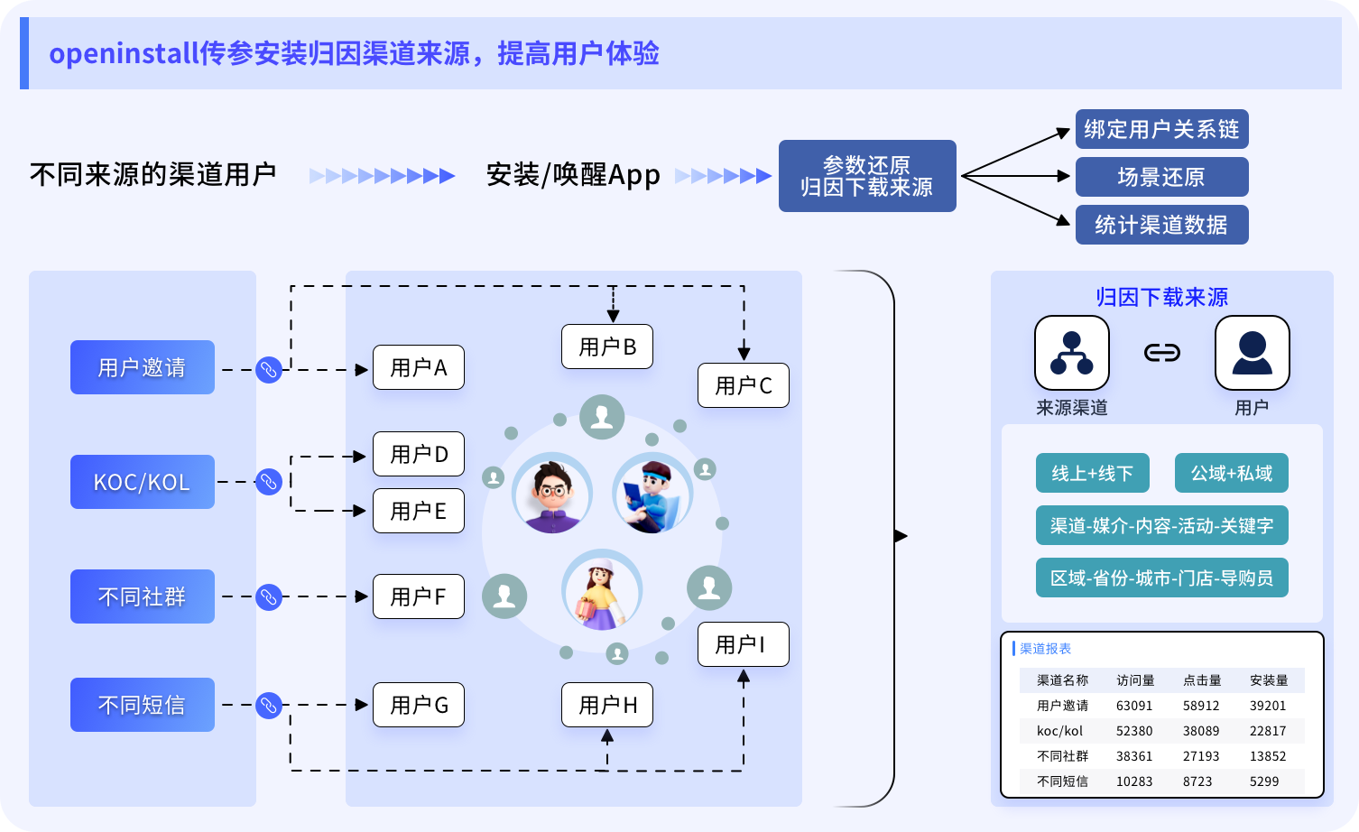 通过传递参数安装、深度链接(DeepLink)等技术,openinstall能够精准匹配用户安装来源,跨端口的准确度在用户正常操作情况下达98%左右。分发参数链接后,无论用户从哪个渠道访问,点击链接完成安装时都能自动关联到原始渠道,实现跨平台归因。