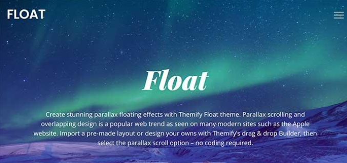 Float是一个高度可定制的 WordPress 企业主题。它具有全屏自定义背景,您可以将其替换为您选择的图像,以使您的网站引人注目。