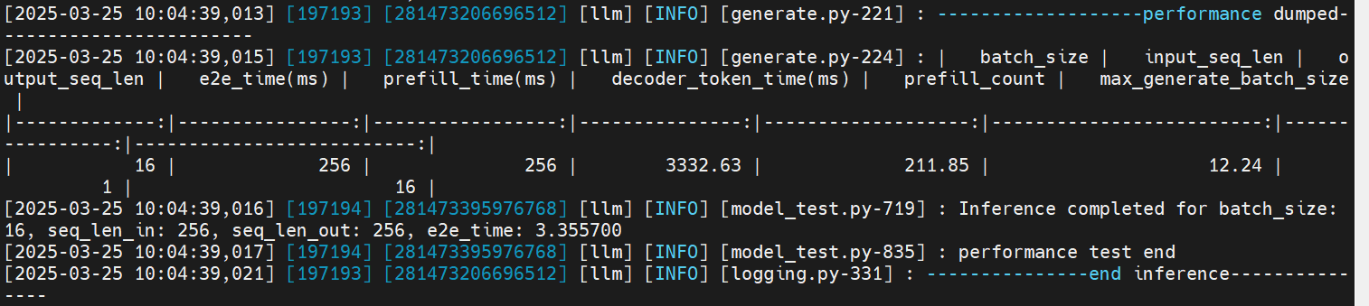 注:[[1024,1024],[256,256]]代表要测试输入长度为1024、输出长度为1024的场景和输入长度为256、输出长度为256的场景;16代表batch_size;最后的“2”代表2卡并行(tensor并行),也可以设置为1,表示单卡运行。