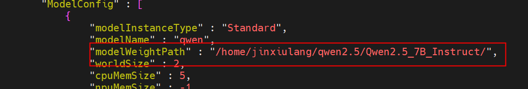 然后打开配置文件(./conf/config.json),配置“modelWeightPath”参数,把qwen模型路径复制上去,其他的参数使用默认值即可: