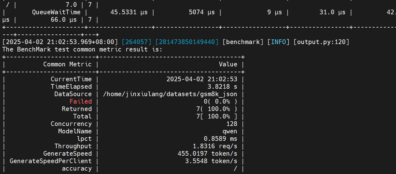 注:[[256,256]]是输入输出长度;“1”代表batch_size;full_GSM8K是文件名,要把1.2节中提到的gsm8k_new.jsonl重命名为full_GSM8K,不带后缀,放到modeltest目录下;最后的“2”代表2卡并行。