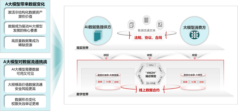 AI大模型带来数据流通的变化与挑战(如图4所示),使得数据提供方比以往更加需要有效的方式,来保障AI模型消费方所签订的协议能够落实,确保数据流通安全合规,保护数据主权。那么,通过什么方法可以解决智能时代数据流通这一难题呢?