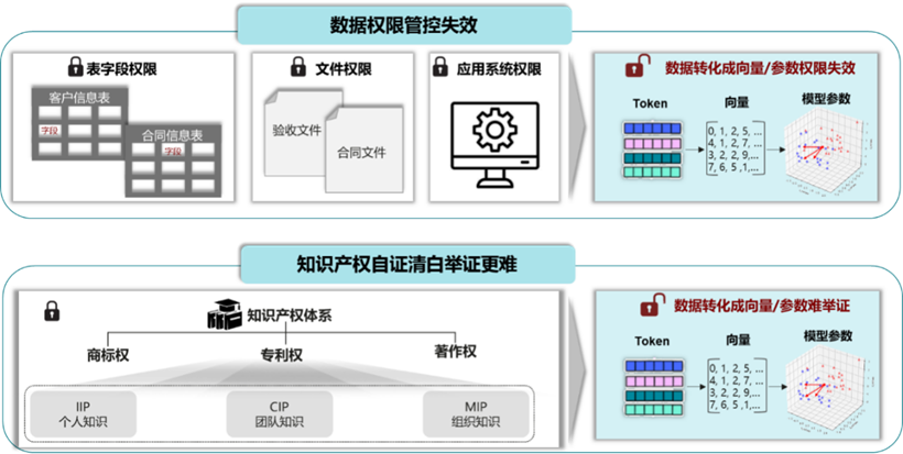 因此,大模型时代数据的使用由原来的表、字段、文件等转化成向量与参数的形态后,传统的权限失效,知识产权侵权举证更难。