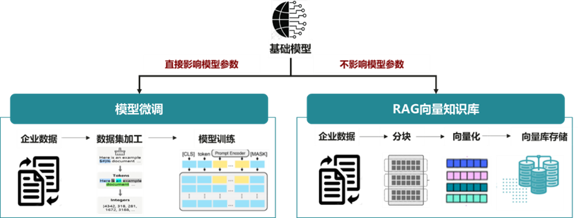 模型微调是指企业在引用基础大模型的基础上,使用企业数据经过清洗、加工、处理后的AI数据集进行二次训练,以适应特定的业务场景或任务。RAG向量知识库则是将企业数据通过分块、向量化后,以向量的形式存储,使得模型能够更有效地检索和利用知识,提高生成内容的准确性和相关性。