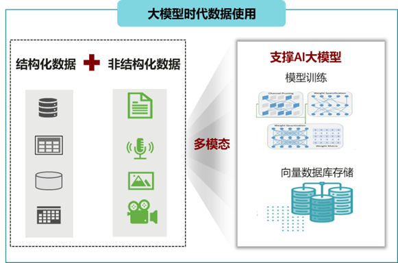 随着AI技术的发展,尤其是AIGC的出现,大幅提升了计算机处理与利用数据的能力,这使得之前无法处理的数据能够被处理,使得之前低价值的数据也可以被有效利用。以往企业数据应用主要是规模较小、模态单一的结构化数据;大模型时代主要应用的是规模较大、多模态的非结构化数据,如图1所示。