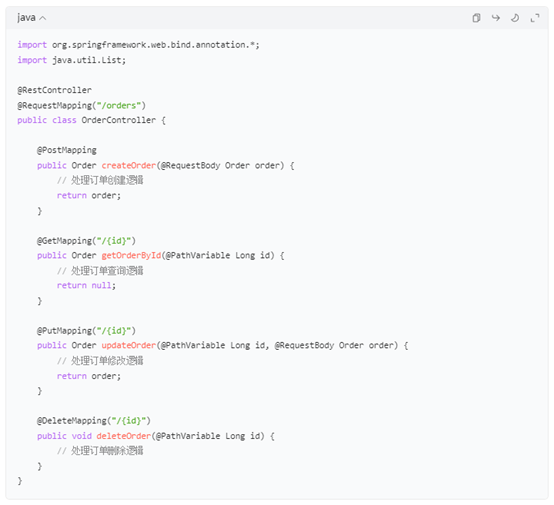 飞算JavaAI可以根据用户输入的业务需求,自动生成符合规范的RESTful API代码。例如,当用户指定需要实现订单的创建、查询、修改和删除功能时,飞算JavaAI会生成相应的Controller类,包含各个接口的处理方法。以下是一个简单的示例: