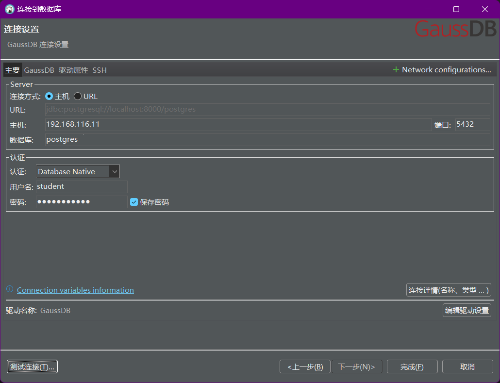 选择GaussDB数据库,点击【下一步(N)>】,在链接窗口输入主机IP、端口号、数据库名、用户名和密码,点击【测试连接(T)…】连接,进行数据库连接测试。