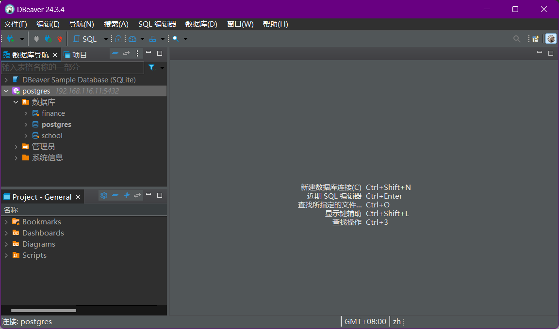测试连接成功后,点击【完成(F)】,连接完成,进入DBeaver主界面。