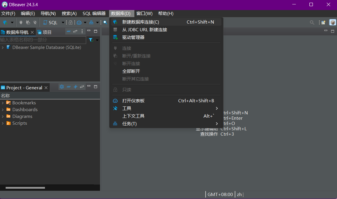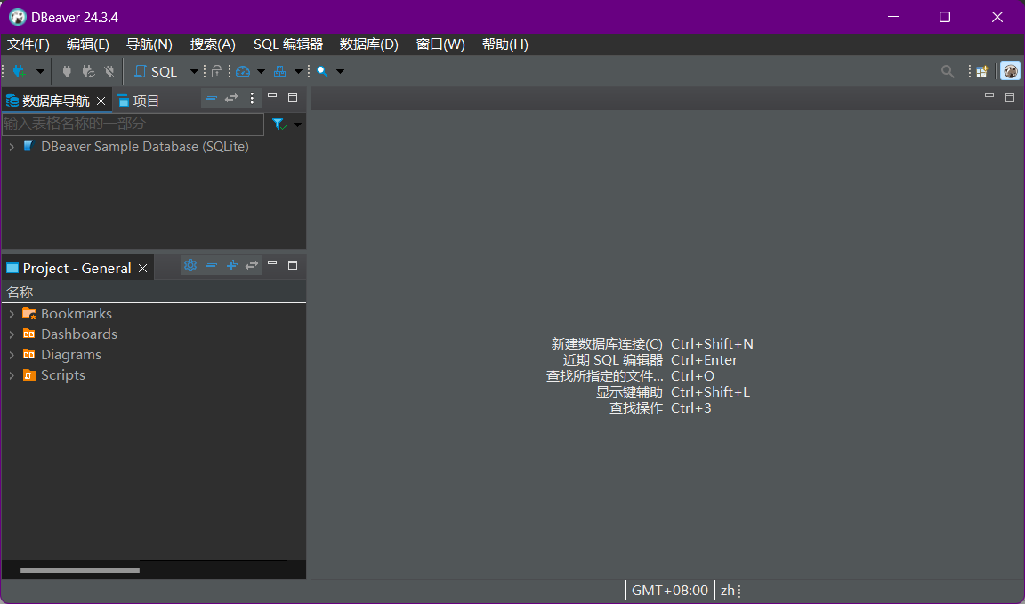 点击DBeaver桌面快捷方式运行dbeaver.exe 可以看到以下界面。DBeaver初步创建一个数据库SQLite。