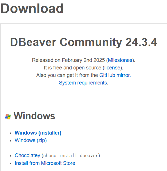 登录https://dbeaver.io/网站,选择下载Windows系统使用的最新版本的DBeaver社区版r如DBeaver Community 24.3.4安装包。