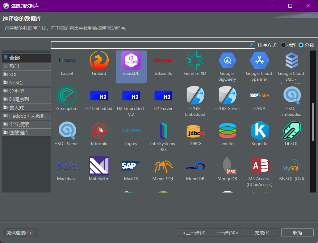 在打开的界面中可看到DBeaver社区版支持的数据库类型。