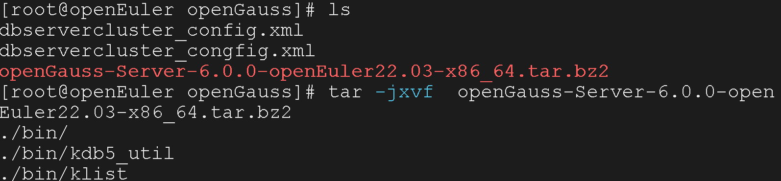 openGauss-Server-6.0.0-openEuler22.03-x86_64.tar.bz2 [root@openEuler openGauss]# tar -jxvf openGauss-Server-6.0.0-openEuler22.03-x86_64.tar.bz2