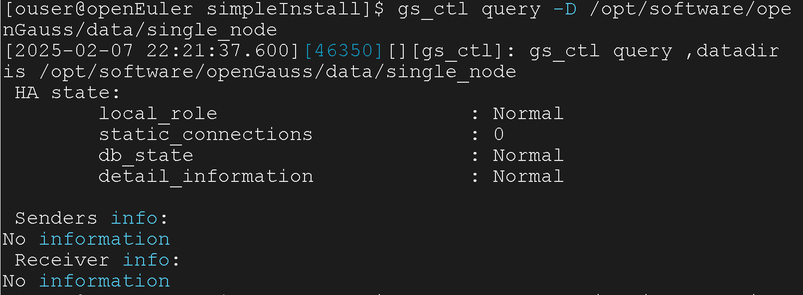 [ouser@openEuler simpleInstall]$ gs_ctl query -D /opt/software/openGauss/data/single_node