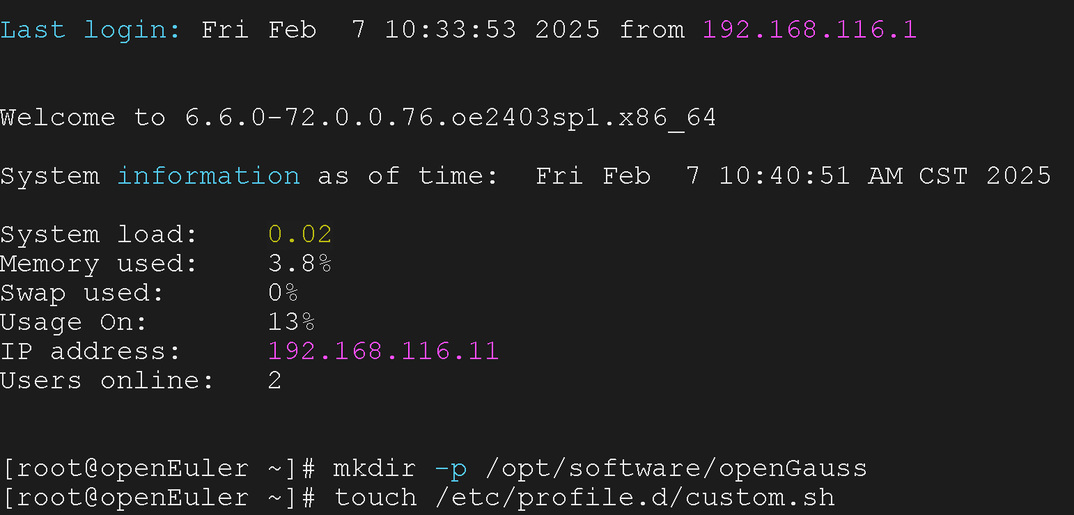 (1)以root身份通过MobaXterm登录openEuler主机,创建openGauss文件夹和用户配置文件。