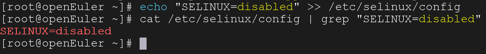 [root@openEuler ~]# echo "SELINUX=disabled" >> /etc/selinux/config