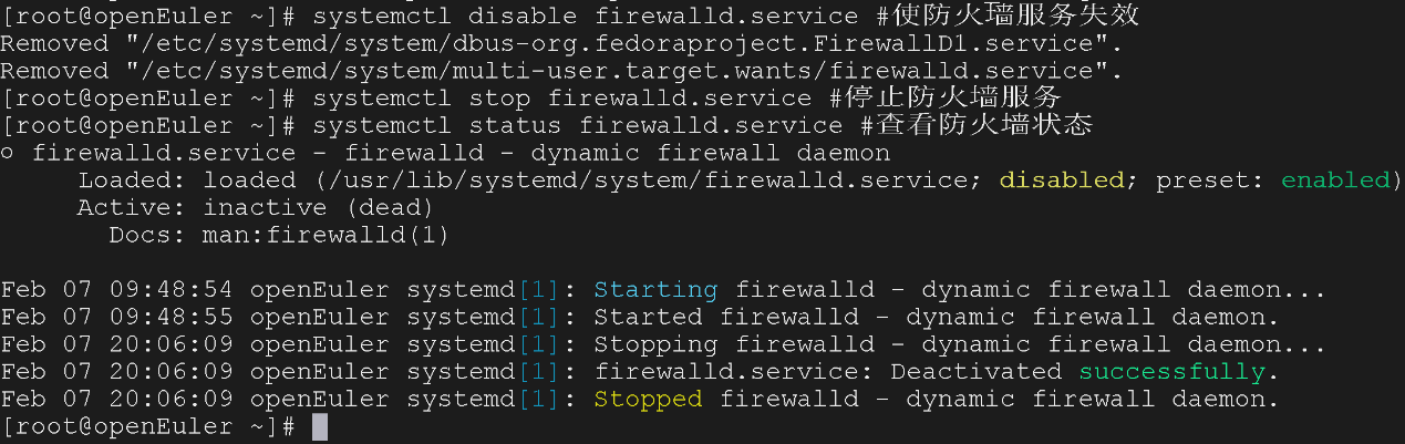 [root@openEuler ~]# systemctl disable firewalld.service #使防火墙服务失效