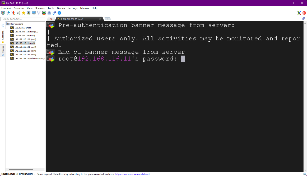 (3)在MobaXterm命令窗口输入root账号登录密码