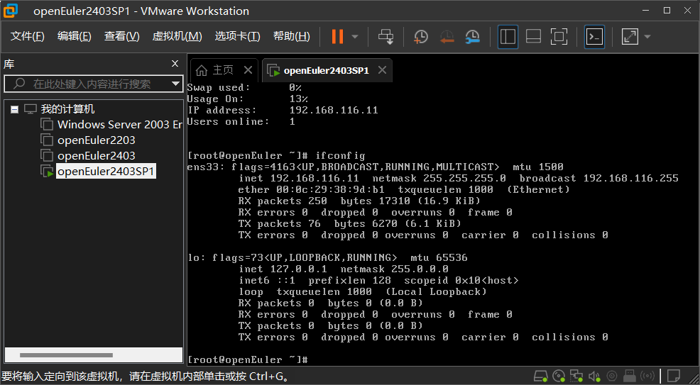 以root身份登录openEuler,在命令窗口输入ifconfig命令,查看ens33网卡所配置的IP是192.168.116.11。